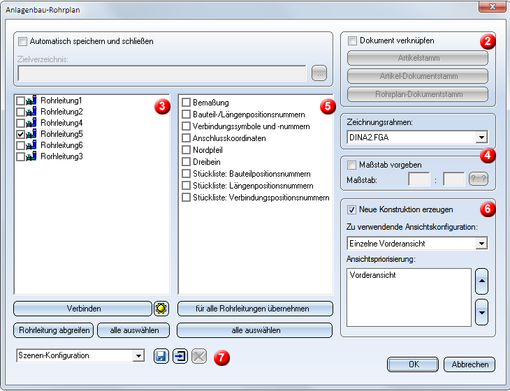 Um die Auswahl der Bauteile zu beenden und die Rohrplanerstellung zu starten, drücken Sie die mittlere Maustaste. Anschließend wird das Dialogfenster Anlagenbau-Rohrplan angezeigt.