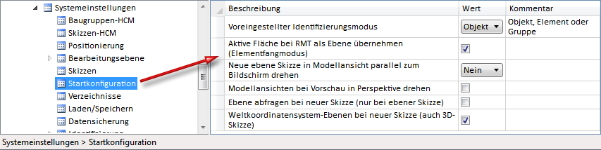Mit Ja wird beim Anlegen einer neuen Skizze automatisch die Wahl der Skizzenebene angefordert. Default: Nein