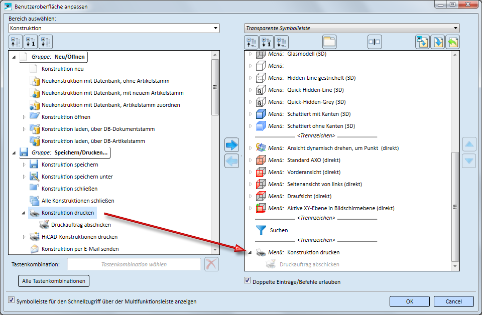 - Sollen auch doppelte Einträge/Befehle in der transparenten Symbolleiste möglich sein, dann aktivieren Sie die Checkbox Doppelte Einträge/Befehle erlauben.