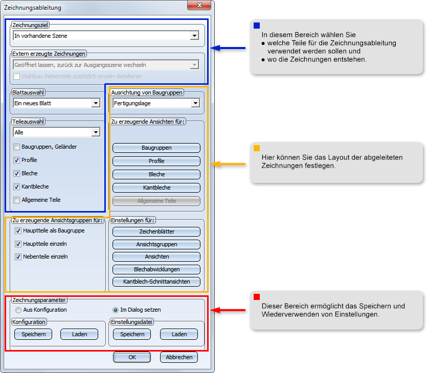 Zeichnungsableitung: Funktionen • Zeichnungsableitung: Einstellungen ändernDas DialogfensterEinstellungsdatei oder Konfiguration • Verwendungszweckabhängige Konfigurationen