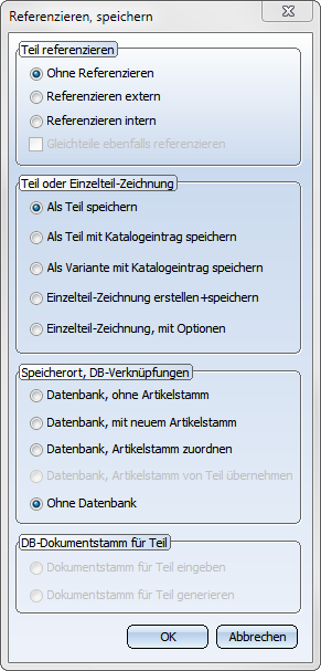 . Setzen Sie die Optionen im Dialogfenster als Ohne Referenzieren, Als Teil speichern und Ohne Datenbank. Klicken Sie auf OK.