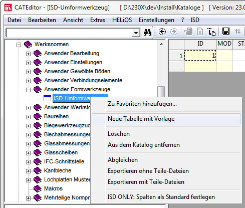 - Wählen Sie den Katalog Werksnormen > Anwender Formwerkzeuge. Dort finden Sie bereits eine Tabelle ISD-Umformwerkzeug vor. Klicken Sie diese mit der rechten Maustaste an und wählen Sie Neue Tabelle mit Vorlage.
