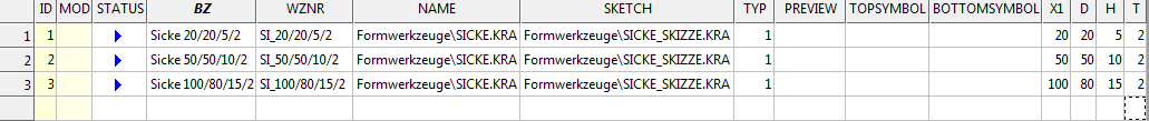 - Legen Sie noch zwei weitere Datensätze an - Sicke 50/50/10/2 und Sicke 100/80/15/2 .