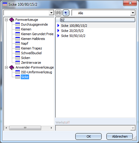 - Tragen Sie dort, mit einem Doppelklick in das Feld, als BZ (Bezeichnung) ein Sicke 20/20/5/2.