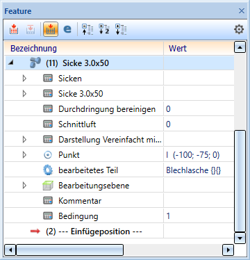 Die Form wird in das Featureprotokoll des Blechteils eingetragen und kann mit einem Doppelklick auf den Eintrag z.B. Sicke 3.0x50 geändert werden.