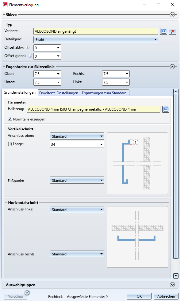 Dialogfenster ALUCOBOND eingehängt - Erweiterte Einstellungen
