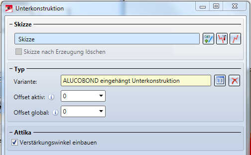 Dialogfenster ALUCOBOND eingehängt - Grundeinstellungen