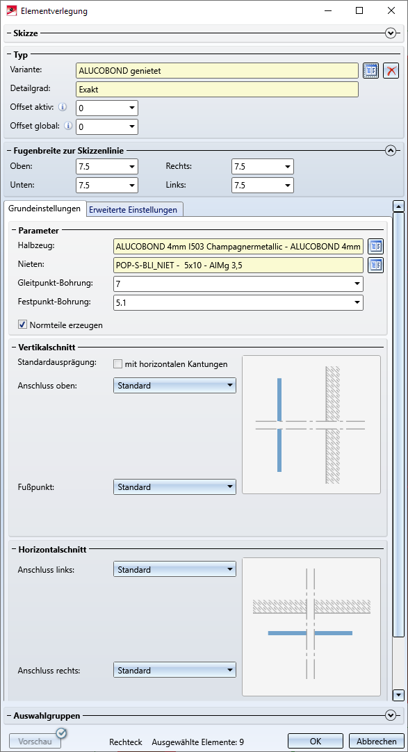 Dialogfenster ALUCOBOND genietet - Grundeinstellungen