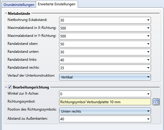 Dialogfenster ALUCOBOND genietet - Erweiterte Einstellungen