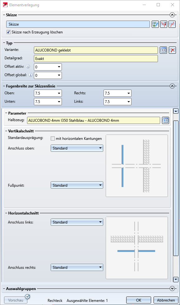Dialogfenster ALUCOBOND geklebt - Grundeinstellungen