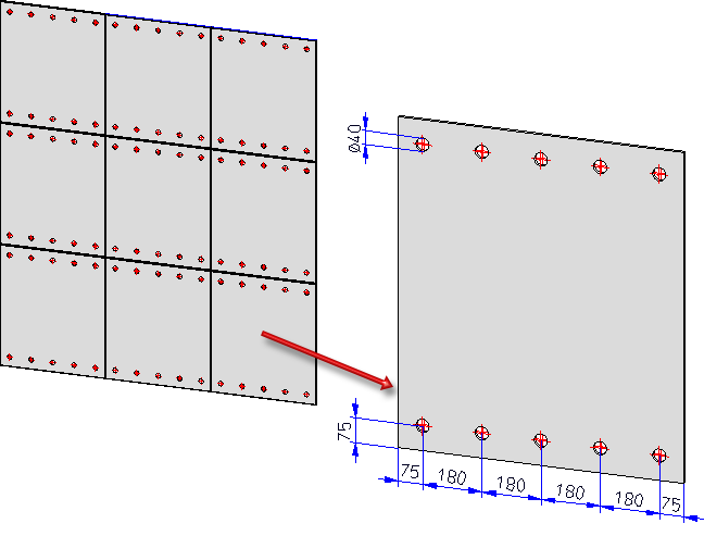 Im folgenden Beispiel wird als Verlegeelement ein gebohrtes Stahlbaublech verwendet. Das Stahlbaublech soll aus einer Skizze abgeleitet werden. Länge und Höhe des Bleches sollen variabel sein. Die Bohrungen sollen gleichmäßig linear auf einer Achse angeordnet sein. Die Anzahl der Bohrungen soll automatisch anhand des maximalen Rasterabstandes ermittelt werden. Der Durchmesser der Bohrungen, der Randabstand der Bohrungen sowie der maximale Rasterabstand sollen variabel sein.