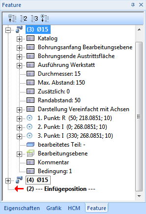 Das Einbau-Koordinatensystem wird in das Feature-Protokoll eingetragen.