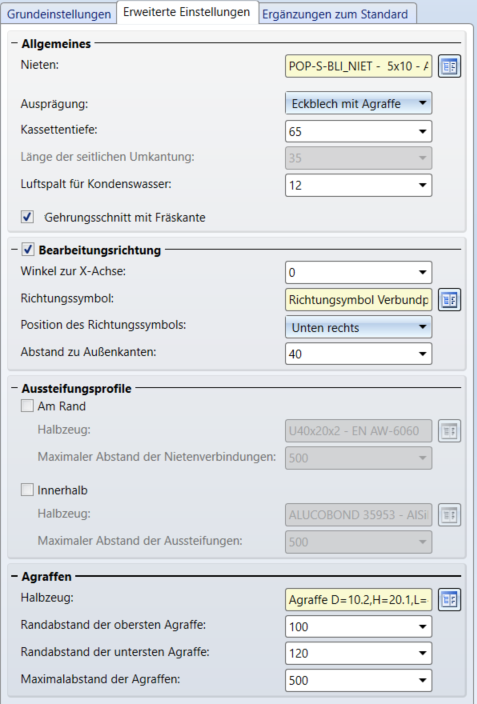 Dialogfenster ALUCOBOND eingehängt - Erweiterte Einstellungen