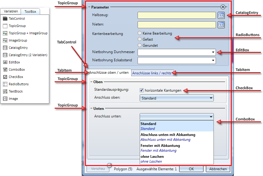 Zu jedem Toolbox-Objekt lassen sich bestimmte Parameter festlegen, die das Aussehen des Objektes im Dialog beeinflussen.