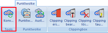 Um den Punktwolkenkonverter direkt aus HiCAD heraus zu starten, wählen Sie die Funktion Punktwolkenkonvertierung starten entweder über die Ribbon-Leiste Punktwolke oder über das Menü Konstruktion > Teil einfügen > Expl...