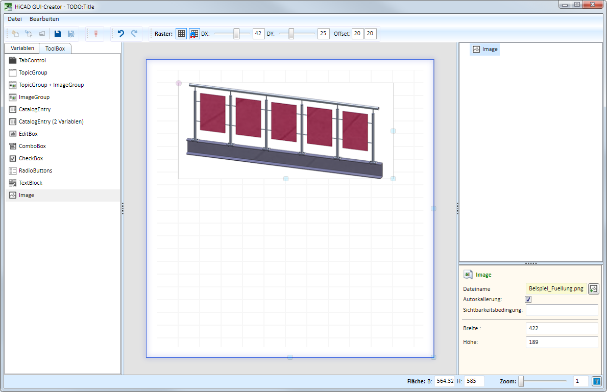Wir wollen zunächst eine Beispielgrafik (z.B. Beispiel_Fuellung.png) mit dem Untertitel Ebene Füllung einbauen. Dazu aktivieren wir die Registerkarte Toolbox, ziehen ein Objekt vom Typ Image in den Dialog und weisen dem Objekt die gewünschten Parameter zu.
