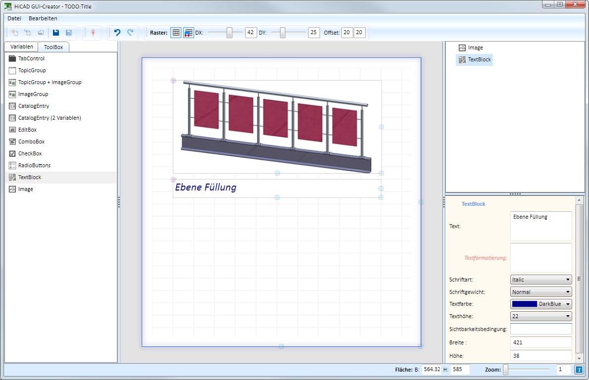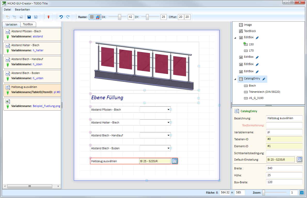 Nachdem wir im ersten Schritt die Beispielvariante einer ebenen Füllung erstellt, gespeichert und automatisch den HiCAD Dialogeditor gestartet haben, können wir jetzt im zweiten Schritt unseren Dialog erstellen.