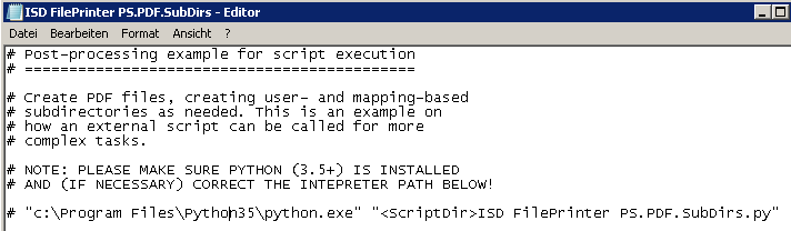 Diese Datei ruft für die weitere Verarbeitung das Python-Skript ISD FilePrinter PS.PDF.SubDirs.py auf, das Sie im gleichen Verzeichnis finden. Durch eine Anpassung dieser Datei können z. B. Druckaufträge von bestimmten Usern und/ oder Hostrechnern jeweils an bestimmte Verzeichnisse gesendet werden.