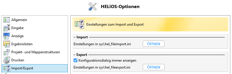 HELiOS-Optionen > Import/Export