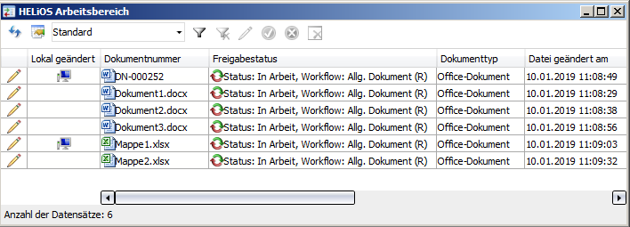 an, wenn ein Dokument seit dem letzten Abgleich mit HELiOS (z. B. durch Laden bzw. Speichern) lokal geändert und gespeichert wurde.