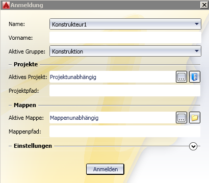Hier können Sie neben Ihrem Login-Benutzer (Name) und der aktiven Benutzergruppe (Aktive Gruppe) auch das Projekt und die Mappe auswählen, in denen gearbeitet werden soll.