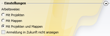In den erweiterten Einstellungen können Sie eine Auswahl treffen, ob Sie mit Projekten, Mappen oder beidem arbeiten wollen. Ausgenommenes wird daraufhin von der Auswahl ausgeblendet: