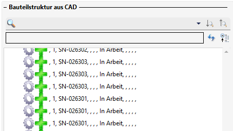 Sie können nun die erste Positionsebene übertragen. Die grünen Markierungen der Teile im linken Fenster bedeuten, dass diese Artikel in der Produktstruktur noch nicht vorhanden sind