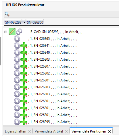 Um die HELiOS-Produktstruktur zu bearbeiten, können Sie im unteren rechten Fenster die Registerkarte Verwendete Positionen aufrufen. Das beim Abgleich von CAD und HELiOS in der PDM-Produktstruktur gesetzte Attribut cad einer Position gibt in der Datenbank an, dass diese aus einem CAD-Programm an HELiOS übertragen wurde. Bei einem erneuten Abgleich der CAD-Teilestruktur mit der PDM-Produktstruktur werden die CAD-relevanten Verknüpfungen entsprechend identifiziert und die Attributwerte neu hinzugekommener, gelöschter oder geänderter Positionen automatisch festgestellt. Das an dieser Stelle angebotene Kontextmenü variiert je nachdem, ob es auf einem Positionsattribut oder einem Artikelattribut aufgerufen wird. Grundsätzlich steht in den Registerkarten Verwendete Artikel und Verwendete Positionen der gleiche Funktionsumfang wie im HELiOS Desktop zur Verfügung.
