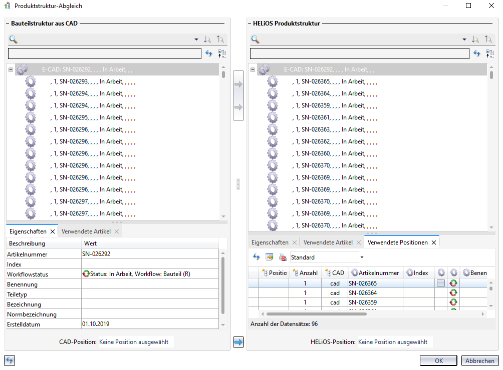 Das Fenster zeigt links unter Bauteilstruktur aus CAD die Teilestruktur des aktiven Artikels und rechts die HELiOS Produktstruktur an.