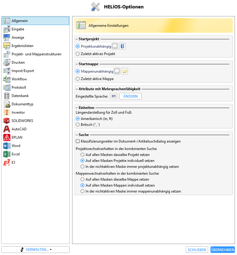 Diese beinhaltet neben den allgemeinen HELiOS-Einstellungen zu Anzeige, Ergebnislisten, Datenbank usw. auch die Optionen-Dialoge aller weiteren Applikationen, die mit Ihrem HELiOS gekoppelt sind: