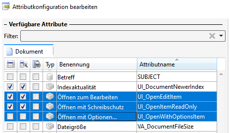 Diesen Aufruf können Sie Dokument-Ergebnislisten ebenfalls hinzufügen, indem sie das entsprechende Attribut (Attributname: UI_OpenWithOptionsItem) in der