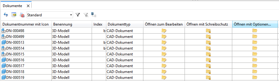 Öffnen mit Optionen... startet nach dem Aufruf einen erweiterten Dialog mit Dateityp-spezifischen Optionen zum Öffnen eines Dokumentes (z. B. können Sie CAD-Dokumente auch "reduziert" öffnen).