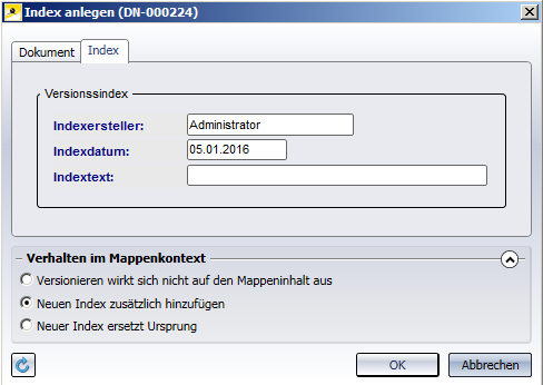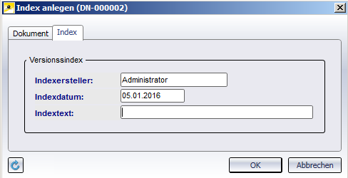 Im Feld Text können Sie einen kurzen Textkommentar zur Version angeben. Dieses entspricht dem Feld Indextext im Dokument-Tab und wird zwischen den beiden Masken synchronisiert. Der Indexstand wird bei der ersten Versionierung auf 1 bzw. "a" gesetzt.