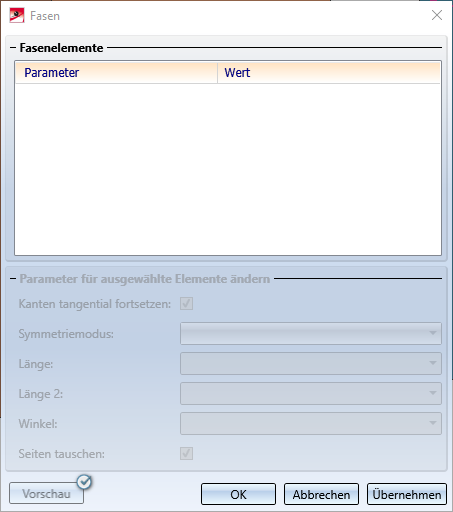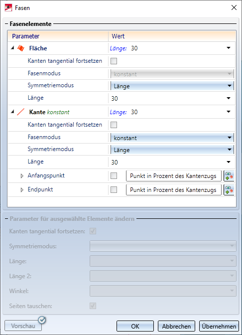 - Unter Parameter für ausgewählte Elemente ändern haben Sie die Möglichkeit, verschiedene Parameter für alle in der Liste der Fasenelemente markierten Elemente in einem Schritt zu ändern.