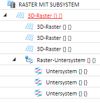 Raster-Untersysteme werden als Nebenteile mit dem Namen Untersystem eingebaut und in einer Baugruppe mit dem Namen Raster-Untersystem zusammengefasst. Dieses Teil wird dem beim Aufruf der Funktion gewählten Raster zugeordnet.