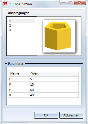 Nach der Parametrisierung rufen Sie unter Konstruktion > Speichern/Referenzieren > Teil... die Funktion Featurevariante erzeugen auf und speichern das Bauteil als Variante, z. B. Prismabsp.vaa. Die Variante enthält jetzt genau einen Datensatz. Ein Vorschaubild wird automatisch erzeugt.