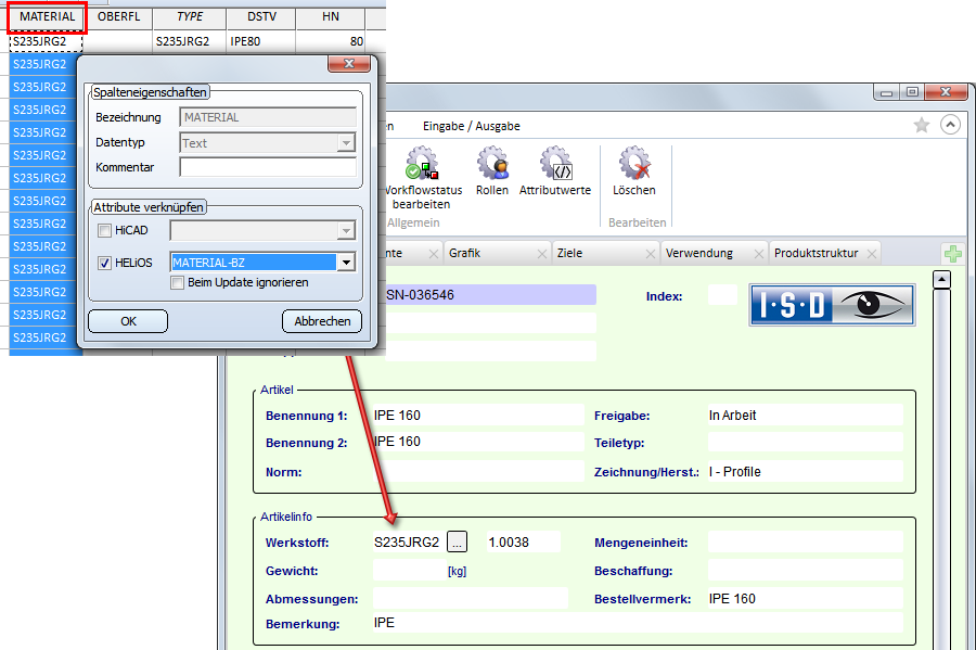Normteile und HELiOS (PDM)Menü HELiOSAttributverknüpfung von Spalten