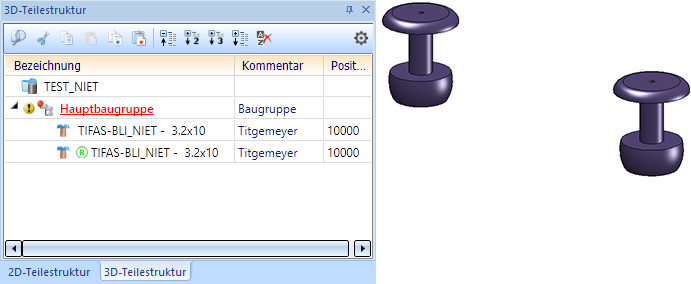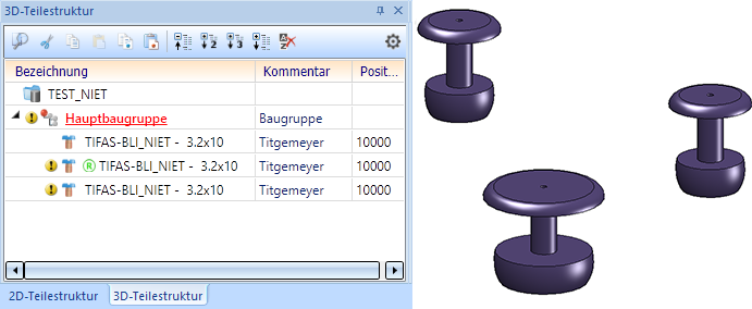 Wird nun der Katalog neu geladen und erneut das Normteil vom Typ TIFA-BLI_NIET - 3.2x10 eingebaut, dann werden nur für dieses Teil die geänderten Daten verwendet. Die zuvor eingebauten Normteile bleiben unverändert. Aber alle Normteile dieses Typs erhalten die gleiche Positionsnummer.