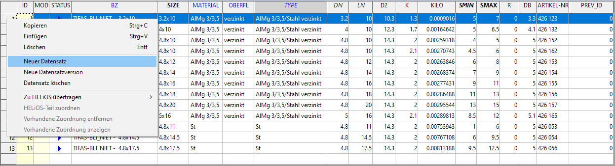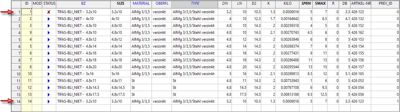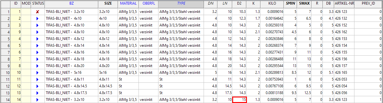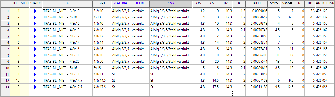 Betrachten wir als Beispiel die Tabelle TIFAS Blindniete großer Flachrundkopf (Aus Gründen der Übersicht sind die Spalten Custom1 bis Custom5 in den folgenden Abbildungen ausgeblendet worden).