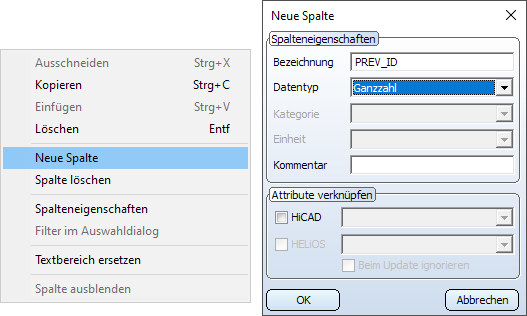 Dazu klicken Sie mit der rechten Maustaste auf eine Spaltenüberschrift der Tabelle und wählen die Funktion Neue Spalte. Im Dialogfenster Neue Spalte geben Sie die Bezeichnung PREV_ID an und wählen als Datentyp Ganzzahl. Dann verlassen Sie das Fenster mit OK.