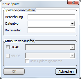 - Soll die Spalte mit einem HiCAD-Attribut verknüpft werden, dann aktivieren Sie die Checkbox HiCAD und wählen Sie das gewünschte Attribut..