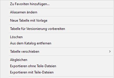 Weitere Funktionen zur Bearbeitung von Tabellen finden Sie im Kontextmenü für Tabellen, das Sie durch einen Klick mit der rechten Maustaste auf einen Tabellennamen aktivieren.