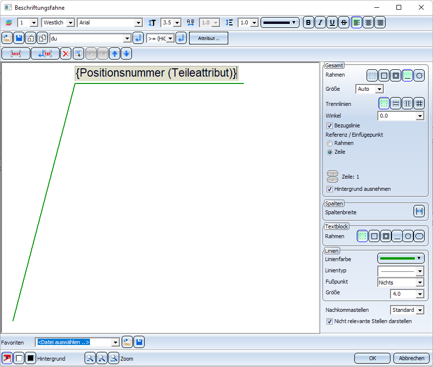 Ist unter Gesamt die Checkbox Bezugslinie aktiv, dann wird die Beschriftung mit einer Bezugslinie erzeugt. In diesem Fall können Sie Im Bereich Linien die Darstellung der Bezugslinie festlegen.
