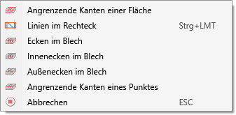 - Wählen Sie in der Konstruktion die zu fasenden Kanten und/oder Flächen aus. Mit der rechten Maustaste lässt sich ein Kontextmenü aktivieren mit weiteren Auswahlmöglichkeiten der zu fasenden Elemente. Beispielsweise lassen sich auch Innen-/Außenecken von Kantblechen wählen oder alle an einen Punkt angrenzenden Kanten.