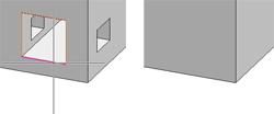 Bitte beachten Sie bei dieser Funktion, dass die gewählten Kanten in derselben Fläche liegen müssen. Ausgehend von diesen Kanten sucht HiCAD dann angrenzende Flächen, die entfernt werden müssen. Nur wenn das Entfernen dieser Flächen zu einem gültigen Modell führt, wird die Löschung ausgeführt. Liegt beispielsweise die Ausnehmung auf einer Kante des Modells, dann würde das Löschen der Ausnehmung zu einem ungültigen Modell führen, da der Algorithmus keine Kanten des Modells "repariert". (siehe Beispiel).