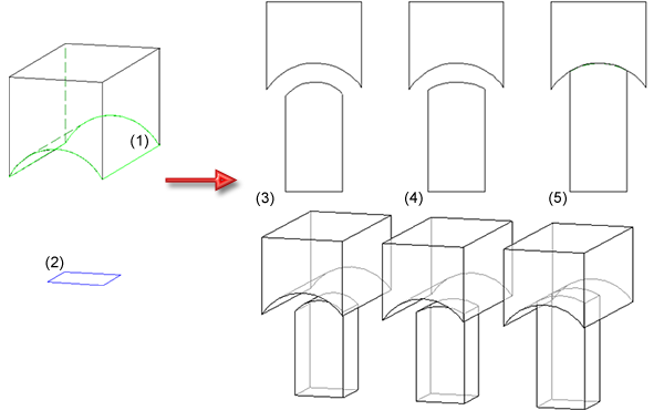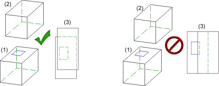 (1) Ausgangsteil mit Skizze, (2) bis Bauteil (3) Draufsicht, Links: Ausnehmung/Anfügen möglich, Rechts: Aktion nicht möglich