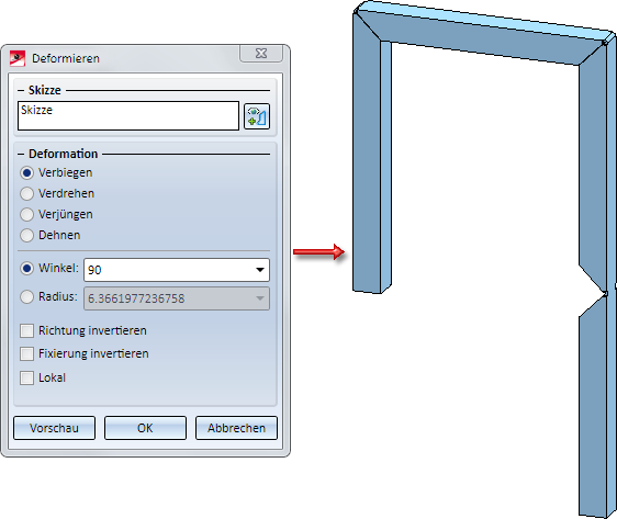 Als Skizze wird die Skizze unter (2) gewählt. Die Verbiegung soll 90° betragen. Die Aktivierung anderer Optionen ist hier nicht erforderlich. In diesem Fall liefern die lokale und globale Verbiegung dasselbe Ergebnis.