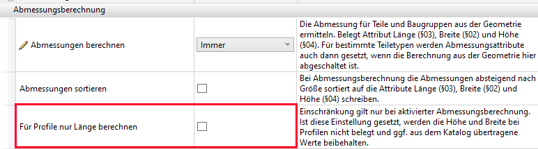 Ist im Konfigurationsmanagement die automatische Abmessungsberechnung aktiv, dann lässt sich über die Checkbox Für Profile nur Länge berechnen die Abmessungsberechnung einschränken (siehe Besonderheiten für Profile und Stahlbleche).
