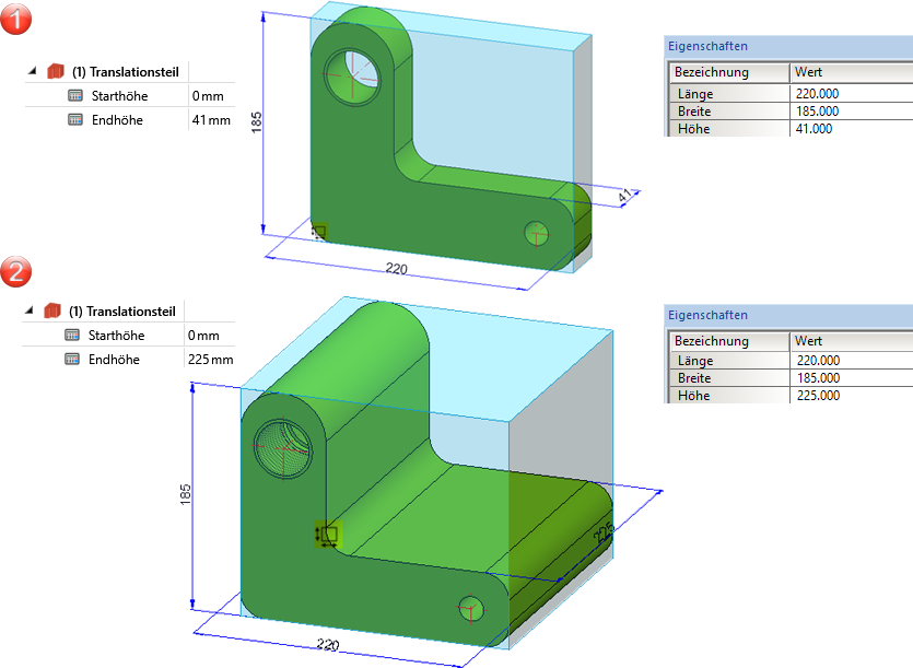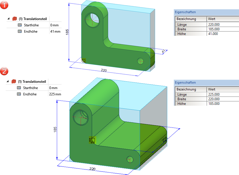 Im folgenden Beispiel ist die automatische Abmessungsberechnung aktiv, die Sortierung jedoch inaktiv. (1) zeigt die Ausgangssituation. Nun wird im Feature die Höhe des Translationsteils geändert (2). Dadurch ändert sich nur der Wert des Attributs Höhe.