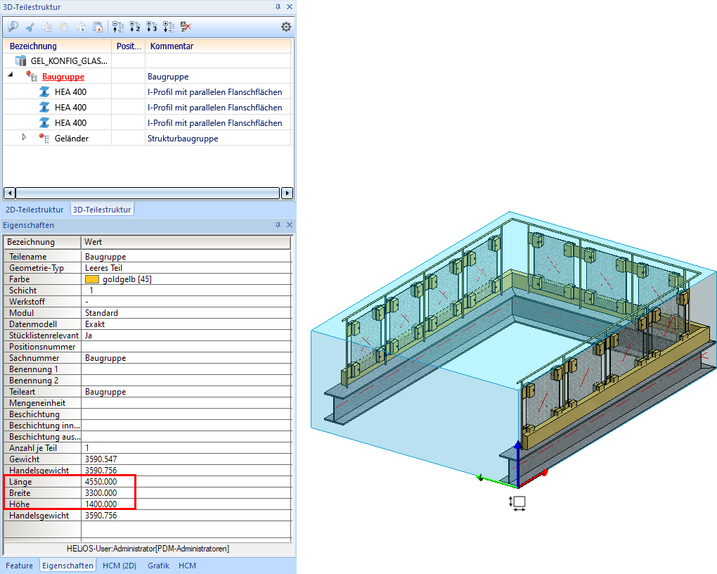 Ist die automatische Abmessungsberechnung deaktiviert, dann werden Länge, Höhe und Breite durch die Stahlbaufunktionen belegt. Dabei werden Länge und Breite sortiert. Das heißt, der größte Wert wird der Länge zugeordnet.